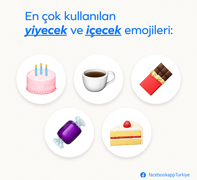 Facebook gönderilerinde ve yorumlarında kullanılan yiyecek içecek emojileri arasında ilk sırada yer alan doğumgünü pastası emojisini ise sıcak içecek ve çikolata emojileri takip etti.